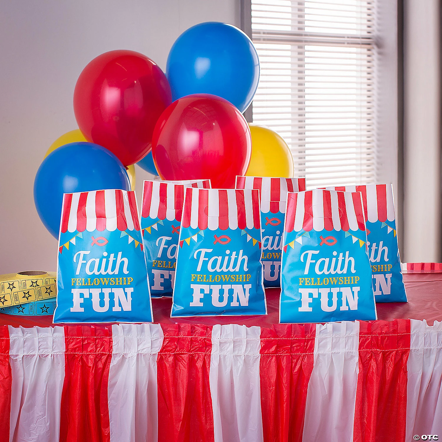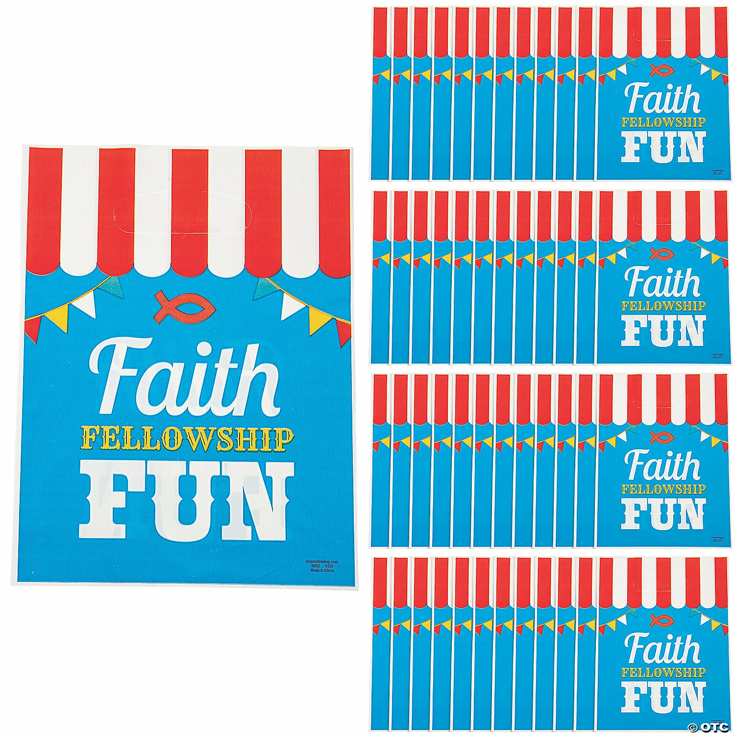 • Perfect Size for Parties: These treat bags are just the right size for candies. Fill them up with tasty treats and hand them out as party favors at your next birthday party or church carnival!• Sweet Style: Display your delicious delights or party favors in style with these bags! You can make a decorative statement at any event with these bags and a few treats.• Say Thanks with Sweets: Are you looking for an easy way to thank the people in your life? These multipurpose bags filled with dainty bonbons, truffles, and mints are sure to delight the eyes as well as the palate.Product Description:Faith, fellowship and fun! These colorful treat bags are perfect for church carnivals or any other carnival or party that is faith-based. Featuring carnival imagery alongside a Christian message, these treat bags will be snatched up quickly! Hand them out filled with treats and goodies or leave a stack at a treat table and allow carnival goers to fill the bags themselves. © OTCSize: 7″ x 9 1/2″ with cutout handle. Quantity: 50Material: Plastic.