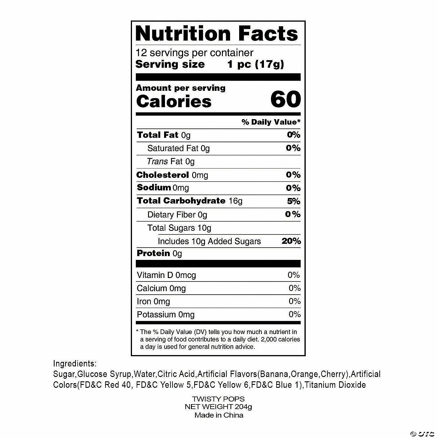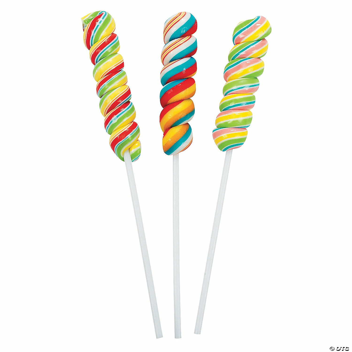 Twisted into fun lollipops bursting with fruity flavor, these sweet striped lollipops are perfect for any party or event! Thanks to their fun design and vibrant colors, these suckers double as party dΓ©cor. Drop them into your party favor bags, candy buffet jars, or Halloween treat bags. Be sure to stock up on these candy favorites for your Trunk or Treat festivities, too! β’Β Assorted fruit flavors β’ Individually wrapped. β’ Includes 3 1/2″ suckers on 2 1/4″ plastic sticks.β’Β Total wt., 7 oz.β’ Assortment may vary. β’Β Fat-free. β’ Candy is non-returnable. For more information, visit our βReturn Policyβ page located on our website.β’ Ingredient, nutrition, allergen and other product information are provided on our Web and Mobile sites for reference purpose only, without warranty or representation as to accuracy. Manufacturers adjust their labeling regularly and are solely responsible for the accuracy of the information. For general questions concerning these items, please contact our customer service at 800-228-0475.
