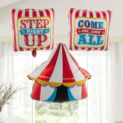 Set the stage for three-ring fun! Make any driveway a midway and any backyard a big top with a trio of step-right-up balloon decorations for your carnival party. Tie this balloon bouquet to a sign to welcome one and all to your school fair or church festival, or use it to decorate the cake table at a circus-themed birthday party. (3 pcs. per set) 18″ – 23″ x 20 1/4″ – 24 1/4″ ยฉ OTC
