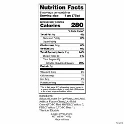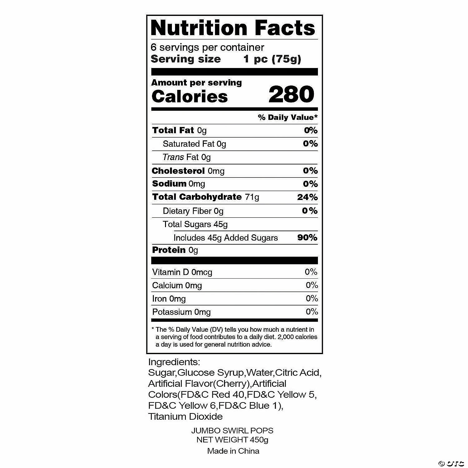 β’ What’s Included: You get 6 jumbo swirl lollipops on plastic sticks. They’re individually wrapped and have big fruit flavor. β’ Non-Returnable: Candy is non-returnable. For more information, visit the Return Policy page located on our website.β’ Important Country of Origin Information: For certain items sold by OTC on our Web or Mobile sites, country of origin information can change and what is displayed may not be accurate or consistent with manufacturer information. For up to date country of origin information, it is recommended that you rely on product packaging or other manufacturer information.β’ Product Information: These jumbo, swirled lollipops are fat-free, dairy-free, gluten-free and nut-free. Details about ingredients, nutrition, allergens and other product information are provided on our Web and Mobile sites for reference purpose only, without warranty or representation as to accuracy. Manufacturers adjust their labeling regularly and are solely responsible for the accuracy of the information. For general questions concerning these items, please contact our customer service at 800-228-0475.Product Description: Jumbo-sized fun on a stick! These oversized jumbo swirl lollipops are big on fun and fruit flavor. They’re perfect as carnival prizes, candy buffet displays and part favors. They’re sure to draw everyone’s eye, especially when in the hands of a little kid. Style in glass jars as sweet decorations for your candy buffet wedding reception, carnival birthday party or circus-themed corporate event. The set includes six individually wrapped jumbo lollipops on plastic sticks. Specs:Size: 4″ lollipop, 7″ stickQuantity: 1 lb. total, 6 lollipopsDietary needs: Fat-free, dairy-free, gluten-free and nut-freeBrand: Β© OTC – Oriental Trading Company