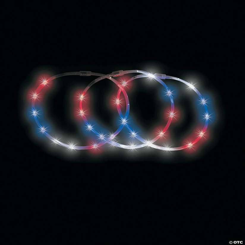 As fireworks light up the sky, you can light up the crowd below with these Patriotic LED Chasing Light Necklaces. Hand them out during 4th of July festivities to brighten up the night with red, white and blue. Get a bunch for everyone as party favors. Batteries included. Remove black tab to activate. Plastic. (6 pcs. per unit) 29 1/2″