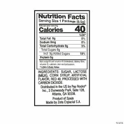 Add a pop of tart cherry to your sugar spree! Great for goody bags, holiday treats and trick-or-treat bags, these cherry pop rocks taste like fresh-picked cherries are exploding in your mouth! Pop some of these sweet party favors into goody bags at celebrations of any kind. Cherry flavor. (24 pkgs. per unit) Total wt., 8 oz. Fat-free.• Candy is non-returnable. For more information, visit our “Return Policy” page located on our website.• Ingredient, nutrition, allergen and other product information are provided on our Web and Mobile sites for reference purpose only, without warranty or representation as to accuracy. Manufacturers adjust their labeling regularly and are solely responsible for the accuracy of the information. For general questions concerning these items, please contact our customer service at 800-228-0475.